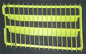 Daher möchte ich die Gitter nachfertigen lassen. Sie sollen im ebenso robusten wie langlebigen glasfaserverstärktem Polyamid im 3D-Druck gefertigt werden. Dadurch wären die Gitter mattschwarz wie die originalen, so dass die originale Optik erhalten bleibt. Das Bild zeigt einen ersten Prototypen nach dem Einscannen eines weitgehend erhaltenen Gitters. Material und Farbe entsprechen nicht den späteren Nachfertigungen. Auch die Oberfläche sowie die defekten Stellen müssen noch aufwändig nachgearbeitet werden. Doch genau darin liegt das Problem. Der Aufwand ist so hoch, dass er sich nur lohnt, wenn mindestens 10 Paar Gitter, also je eines rechts und links, zusammenkommen.
